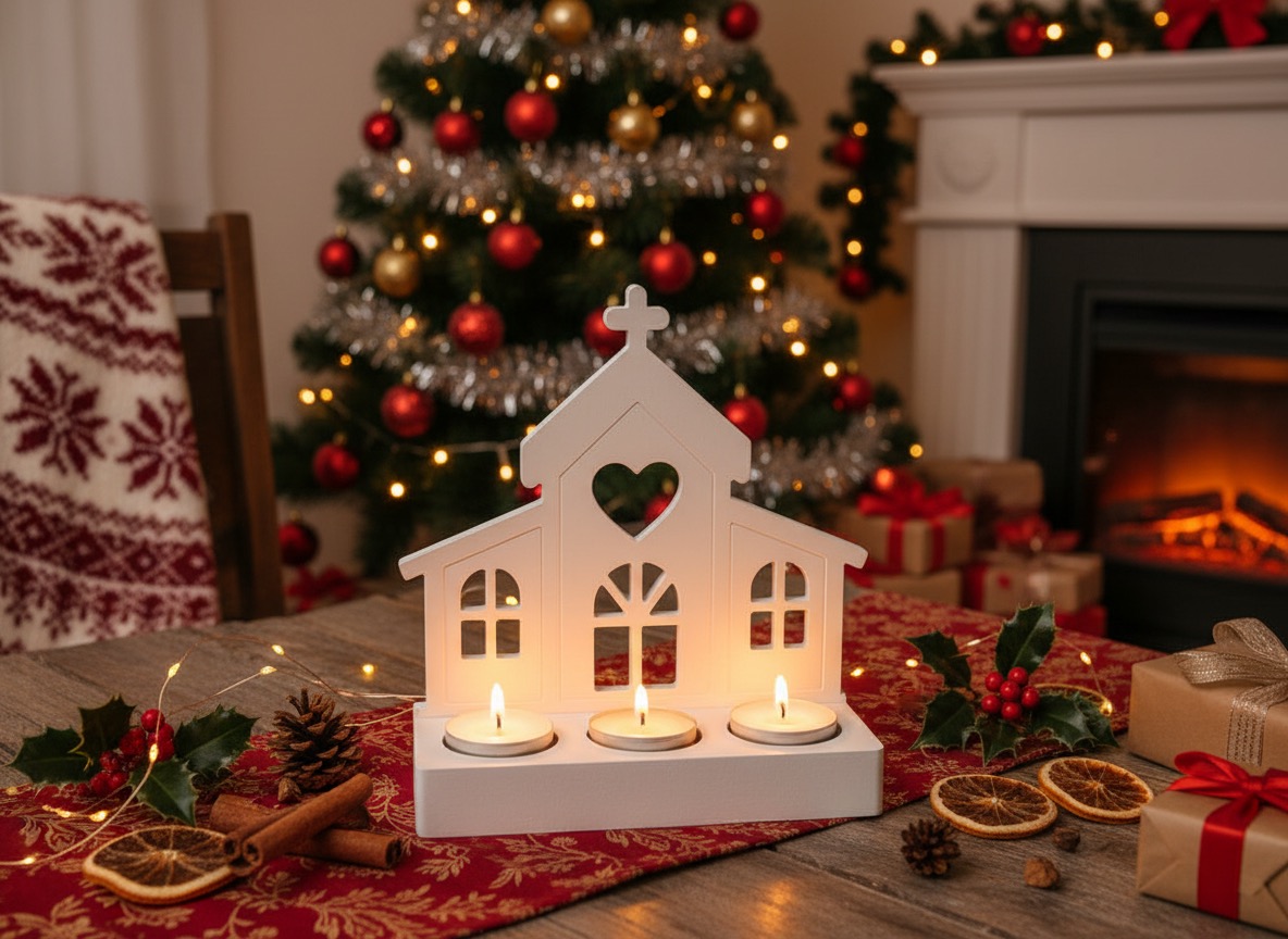 Tento svícen je navržen ve tvaru kostela, což dodává prostoru zvláštní atmosféru a pohodu. Jeho bílá barva zajišťuje čistotu a svěžest, zatímco detaily architektury kostela dodávají svícnu eleganci a šarm.