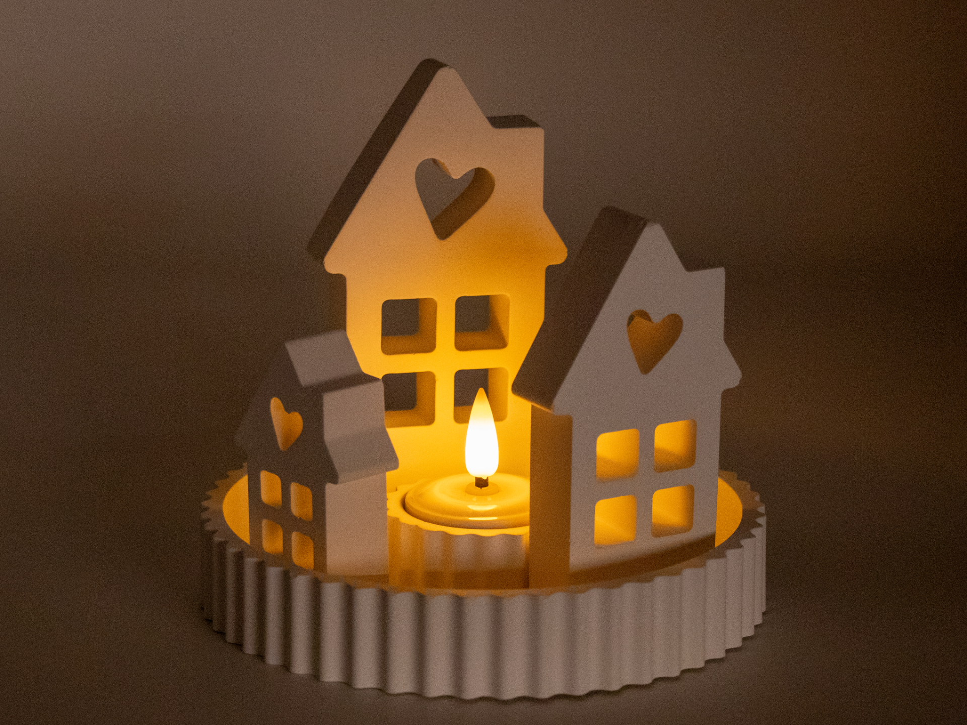 Domečky na podstavci vytvářejí harmonický celek a drobné detaily dodávají dekoraci jemnou hloubku a kouzelnou atmosféru. Světlo čajové svíčky proniká mezi domečky a přináší do prostoru pocit klidu, tepla a útulna.